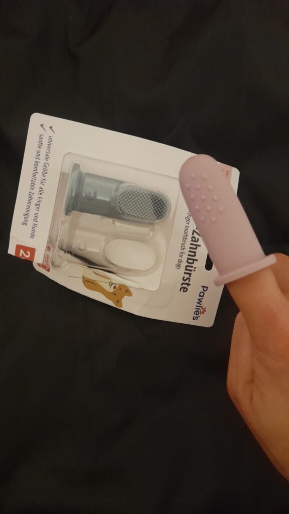 Unser Hund lässt es zwar gut zu sich die Zähne mit der „normalen“ Hundezahnbürste putzen zu lassen, aber ich habe schon länger überlegt, ob ein Fingerling nicht sinnvoller und praktischer wäre.Deshalb wollte ich die Fingerlinge gerne ausprobieren, als sie angeboten wurden.Das Paket kam wie immer schnell und gut verpackt an, die Fingerlinge sind sogar „zu gut“ verpackt, ohne Schere bekommt man die verschweißte Packung nicht auf.Die Fingerlinge riechen neutral und fühlen sich angenehm an, ein absoluter Pluspunkt!Beim Ausprobieren war ich überrascht, wie positiv unser Hund den Fingerling angenommen hat, die Zahnpasta war die gleiche, die ich sonst auch nutze, aber endlich bin ich ohne Probleme bis ganz an die Backenzähne gekommen, sonst hatte ich immer das Gefühl, dass sie die Zahnbürste mit der Zunge rausdrückt.Der Fingerling lässt sich aus super abspülen, laut Hersteller kann er auch in die Spülmaschine, das ist vom hygienischen Aspekt spitze! Wir werden den Fingerling regelmäßig nutzen, laut Hersteller sollen sie alle 12 Wochen ausgetauscht werden, das bedeutet, die 2er Packung reicht für 6 Monate, dafür ist der Preis von 7,99 Euro vollkommen in Ordnung!Einen Stern Abzug gibt es dafür, dass man mit dem Fingerling bestimmt sehr gut den Zahnbelag abbekommt, aber um den Zahnstein wie im Bild zu entfernen muss der Tierarzt ran…..